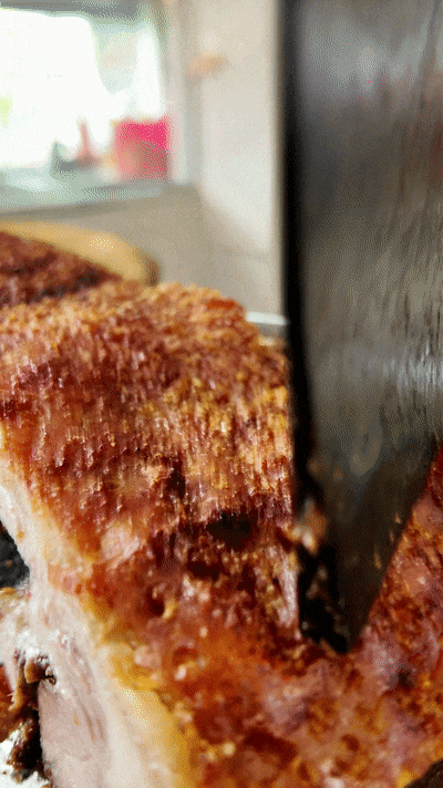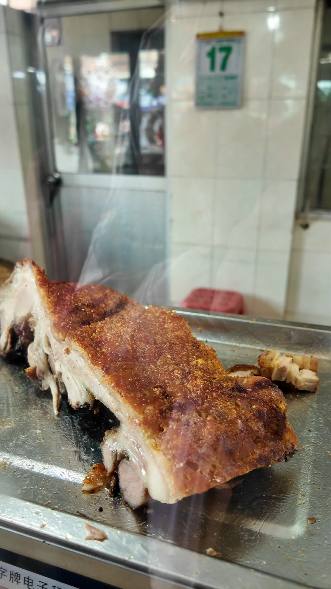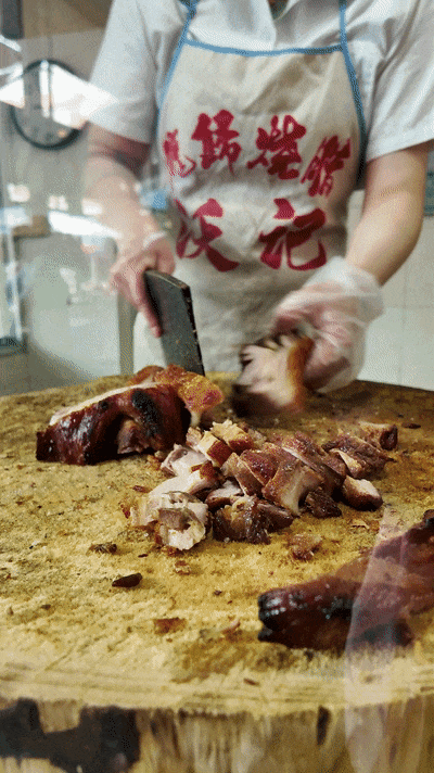 这诱人味道,全靠独特的烧制工艺:师傅会将猪皮刺穿,然后用木炭慢慢烧制,新鲜烧制出来的麻皮烧肉皮酥肉嫩,色泽诱人,光看着已经让人忍不住咽口水了!