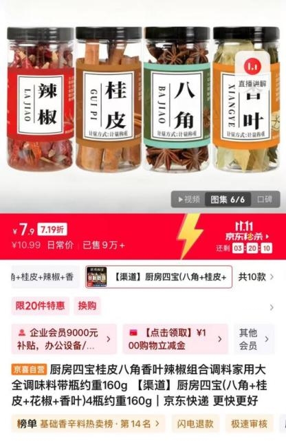 在调味品品类中,来自安徽亳州产业带的“厨房四宝”表现尤为瞩目。这套由八角、花椒、香叶、桂皮组成的调味套装,在京东11.11“京喜甄选购物季”活动中,12小时内售出16万瓶。这一成绩不仅刷新了亳州香辛料产业带的线上销售纪录,也标志着京喜自营已成为该产业带的重要增量市场,从而带动核心产区3000亩香料种植基地的商品转化率大幅提升。